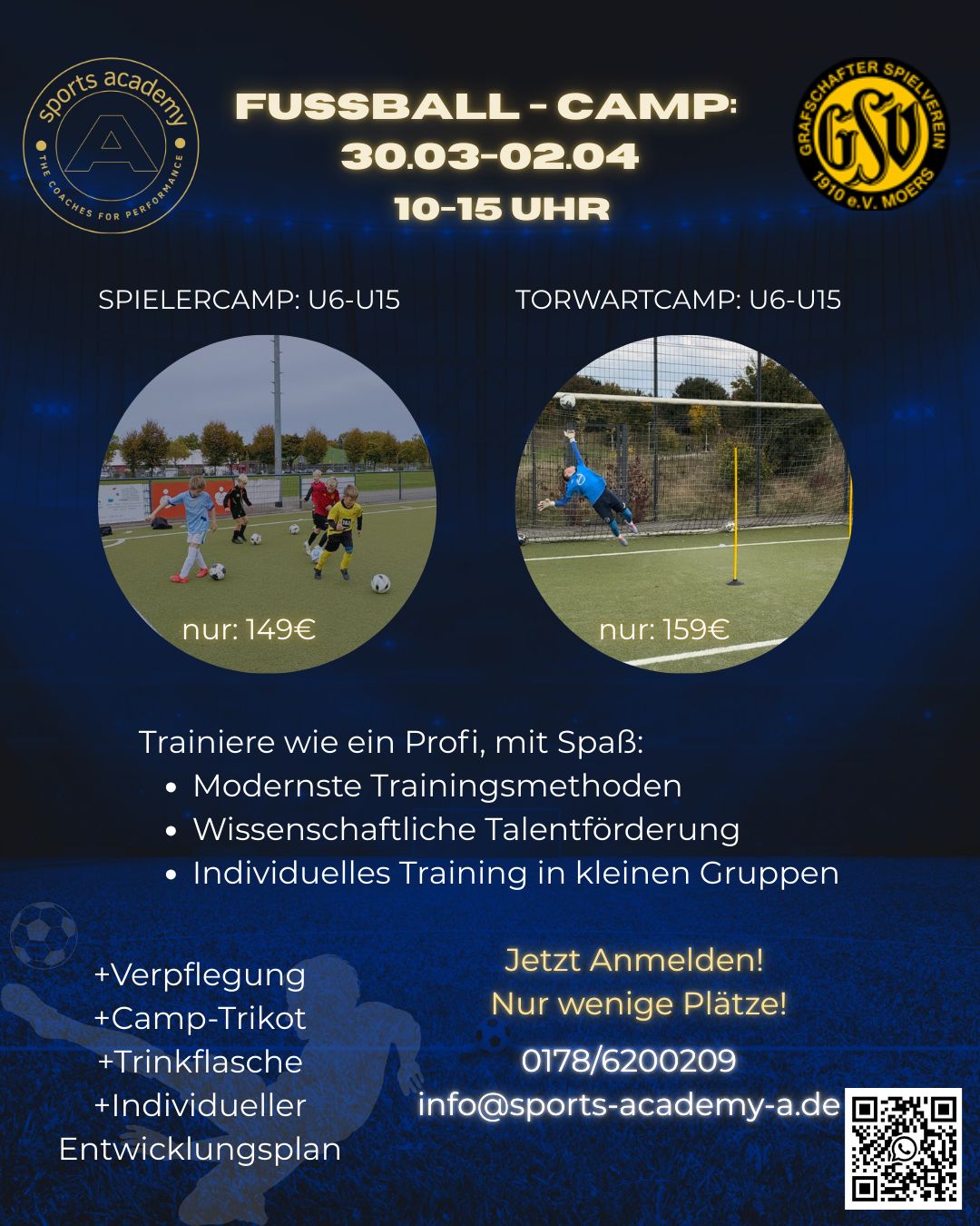 Die Sports Academy A ist deine professionelle Fußballschule in Duisburg und Moers. Wir fördern Kinder und Jugendliche individuell und passen jedes Training an das Leistungsniveau und die Position an – ob Stürmer, Verteidiger, Mittelfeldspieler oder Torwart. Mit modernen Trainingsmethoden, Technikschulung und gezieltem Athletiktraining verbessern wir Schnelligkeit, Kraft und Beweglichkeit. Bei uns steht jeder Spieler im Mittelpunkt, damit er sich bestmöglich entwickeln und sein Potential voll ausschöpfen kann.